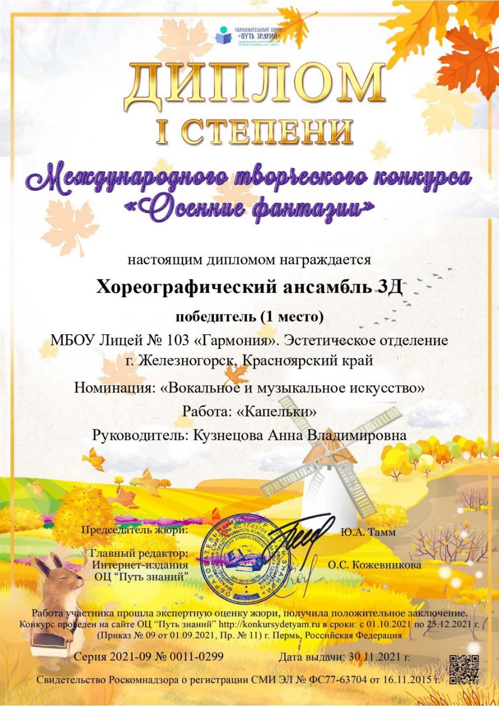 - Хореографический ансамбль 3 «Д» - Диплом I степени - Вокальное и музыкальное искусство (Рук. Кузнецова А.В.)