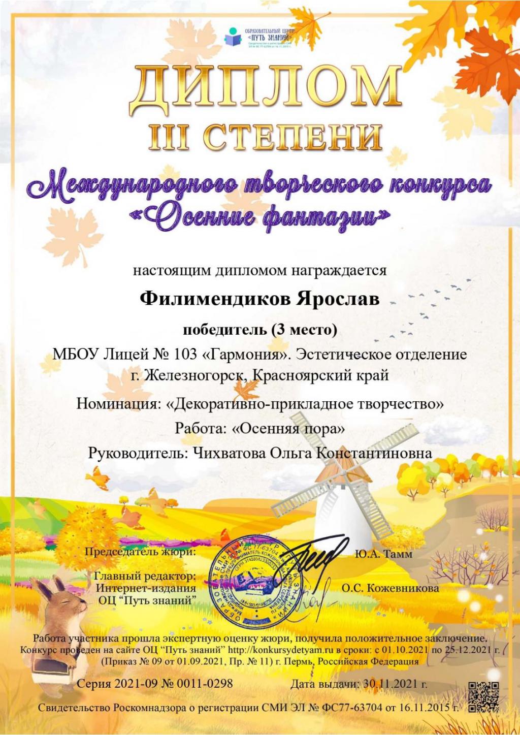 16.12.2021Наши лицеисты приняли участие в Международном творческом конкурсе "Осенние фантазии".