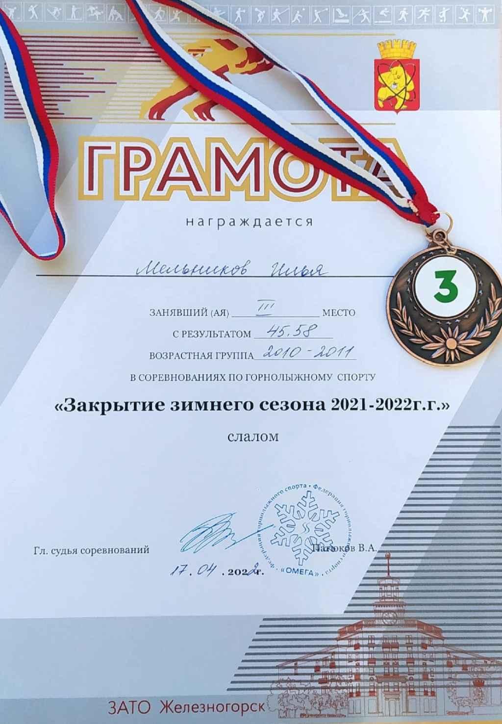2. 17 апреля в городе Железногорске состоялось закрытие зимнего сезона 2021-2022 по горнолыжному спорту. Наш ученик Илья Мельников занял III место среди юношей 2010-2011 г.р.