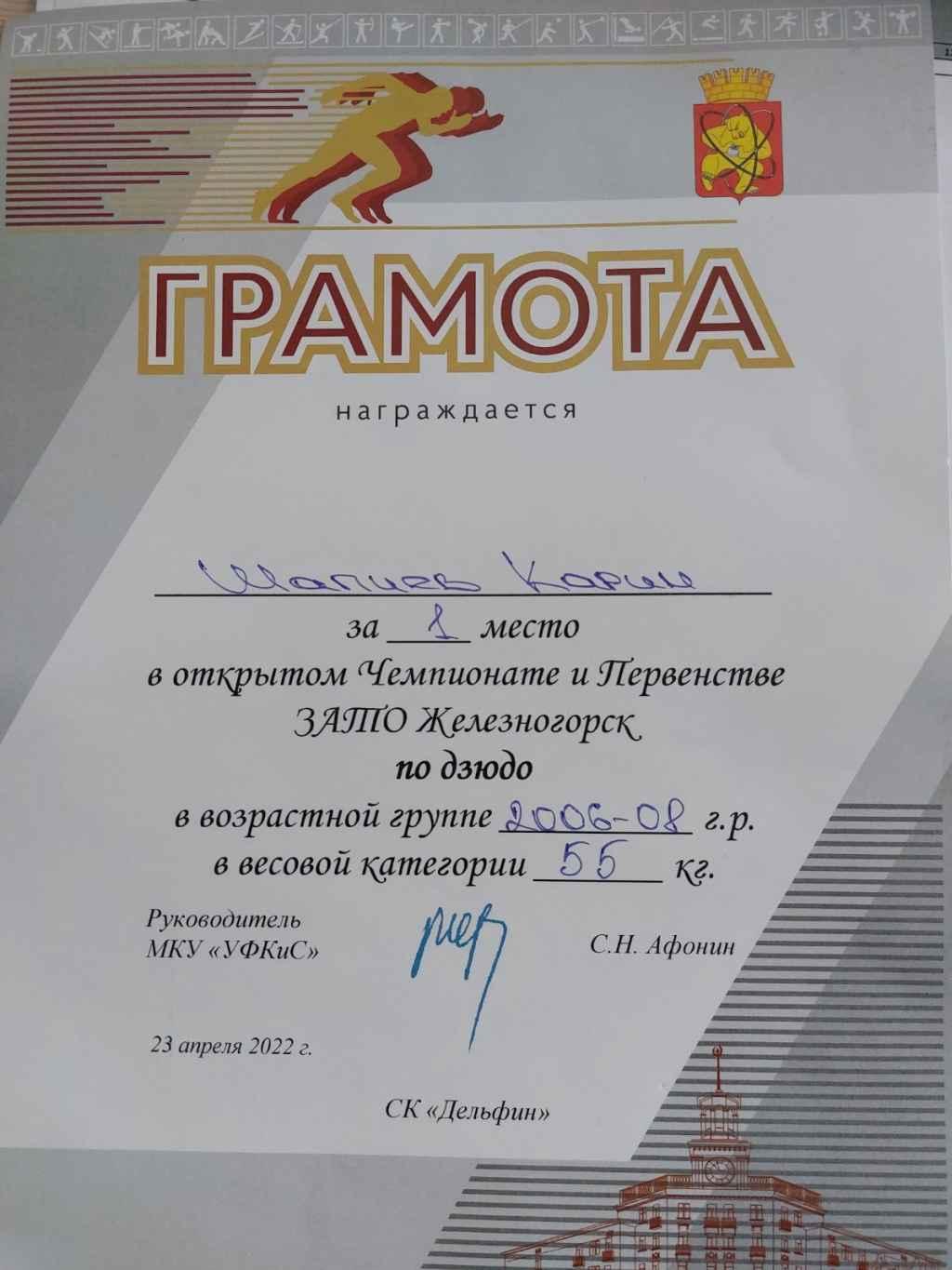 4. 23 апреля в Железногорске состоялся открытый чемпионат и первенство по дзюдо. Карим Шапиев занял I место среди юношей 2006-2008 г.р.
