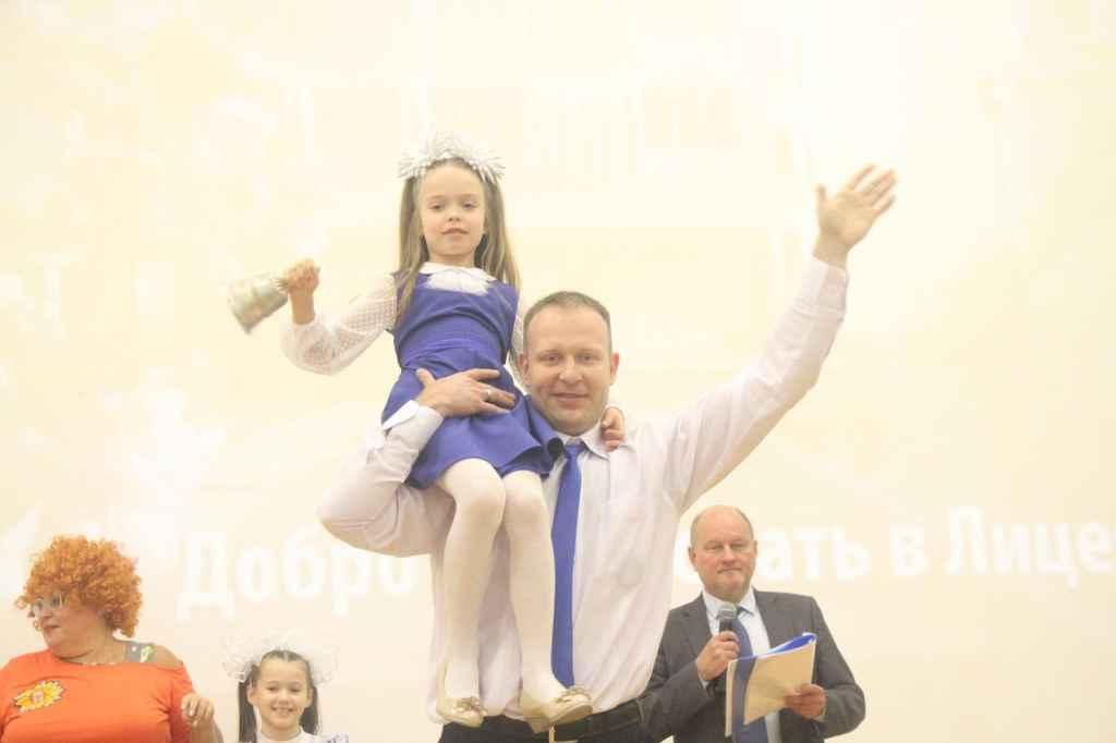 А потом – сюрприз. Первый звонок подает первоклассница Маша Капчинская а несет ее на могучих плечах папа Капчинский И.А., который закончил Лицей №103 ровно 25 лет назад, в 1997 году. Интересный подарок для Лицея и отличное начало нового учебного года!