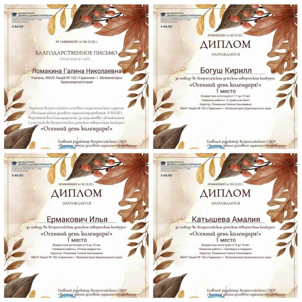 10.10.2022Наши ученики под руководством Ломакиной Галины Николаевны приняли участие во всероссийском конкурсе "Осенний день календаря".