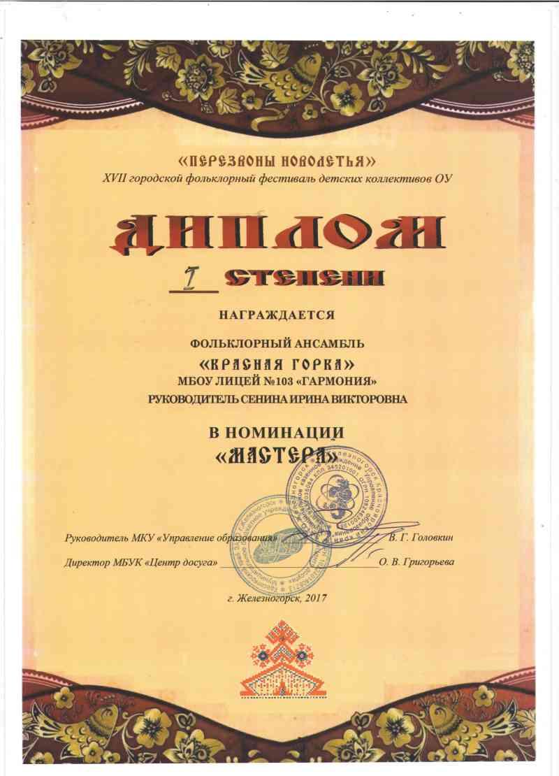 26-27 апреля в МБУК «Центр Досуга» состоялся долгожданный XVII городской фольклорный фестиваль «Перезвоны Новолетья», на котором фольклорный ансамбль лицея «Красная горка» представил разнообразную концертную программу, включающую в себя вокальные и хореографические жанры и был награжден дипломом 1 степени в номинации «Мастера».