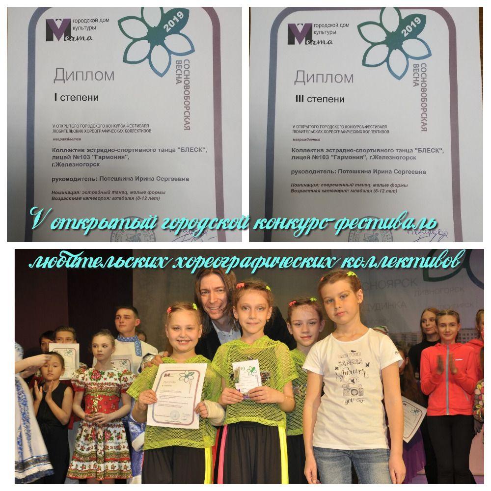 27 апреля в г. Сосновоборске прошел V открытый городской конкурс-фестиваль любительских хореографических коллективов. В программе было 110 танцевальных номеров, участники приехали из Енисейска, Железногорска, Сосновоборска, Красноярска, Емельяново, Бархатово, Березовки и других территорий края. Учащиеся 2 «Д» класса очередной раз показали себя на высоком уровне, дипломы I и III степени в номинациях по современному и эстрадному танцу!