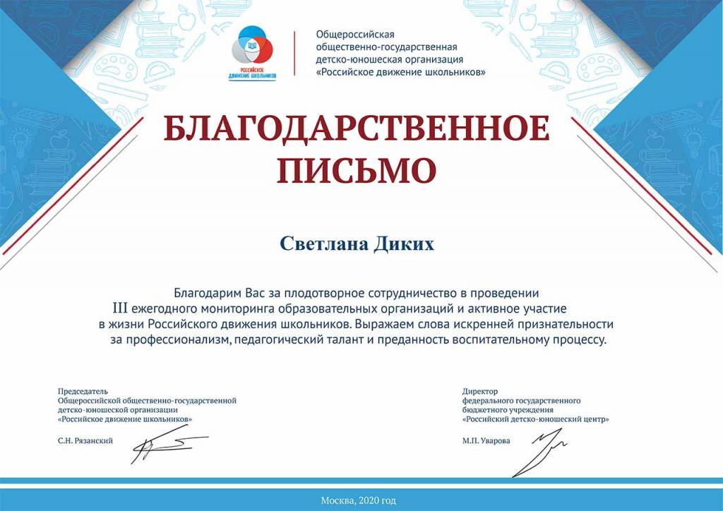 Общероссийское отделение РДШ выразило благодарность за содействие и преданность воспитательному процессу!