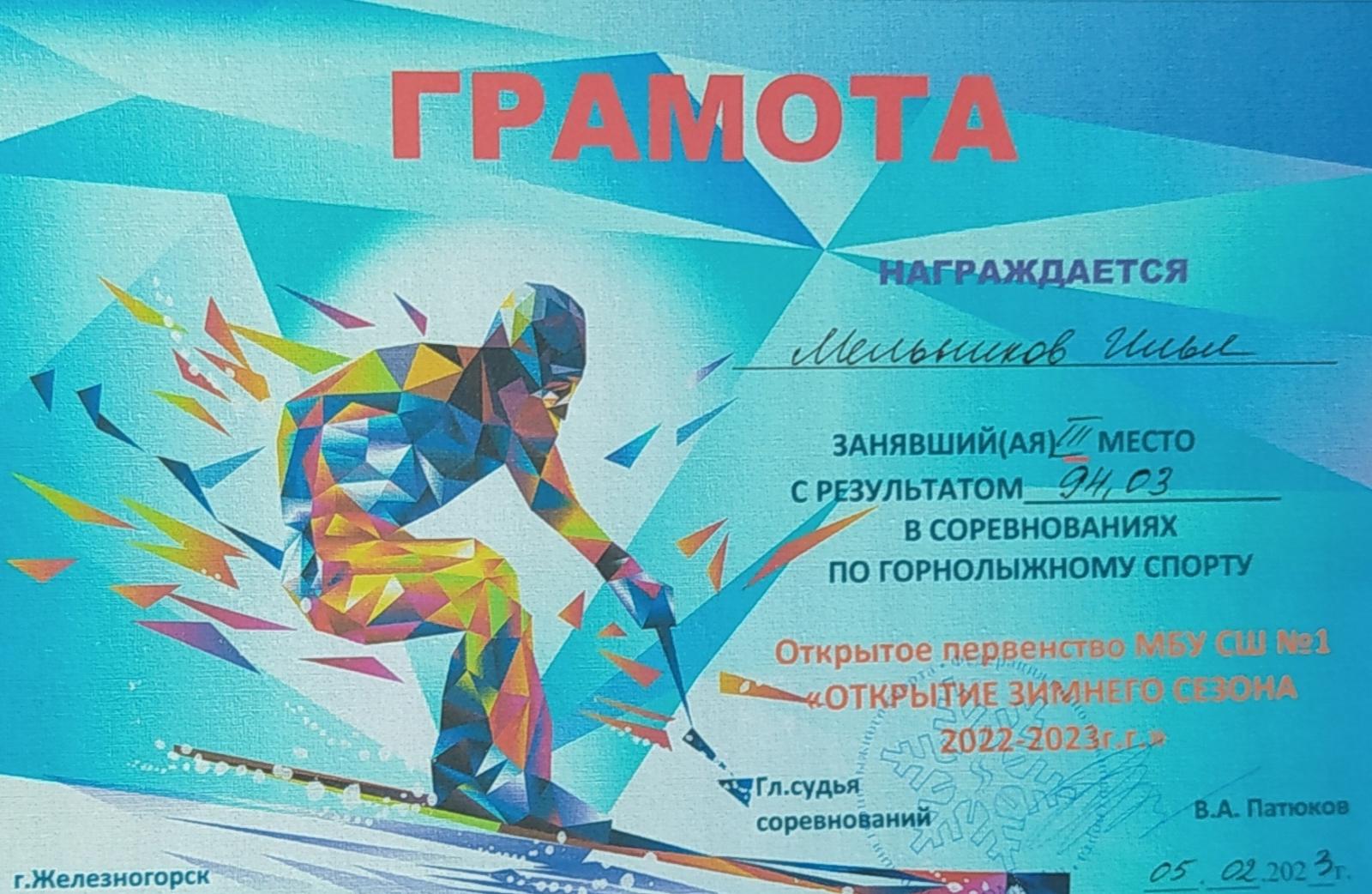 1. Пятого февраля в городе Железногорске состоялись соревнования по горнолыжному спорту. Наш ученик Илья Мельников 5 "Л" занял III место!