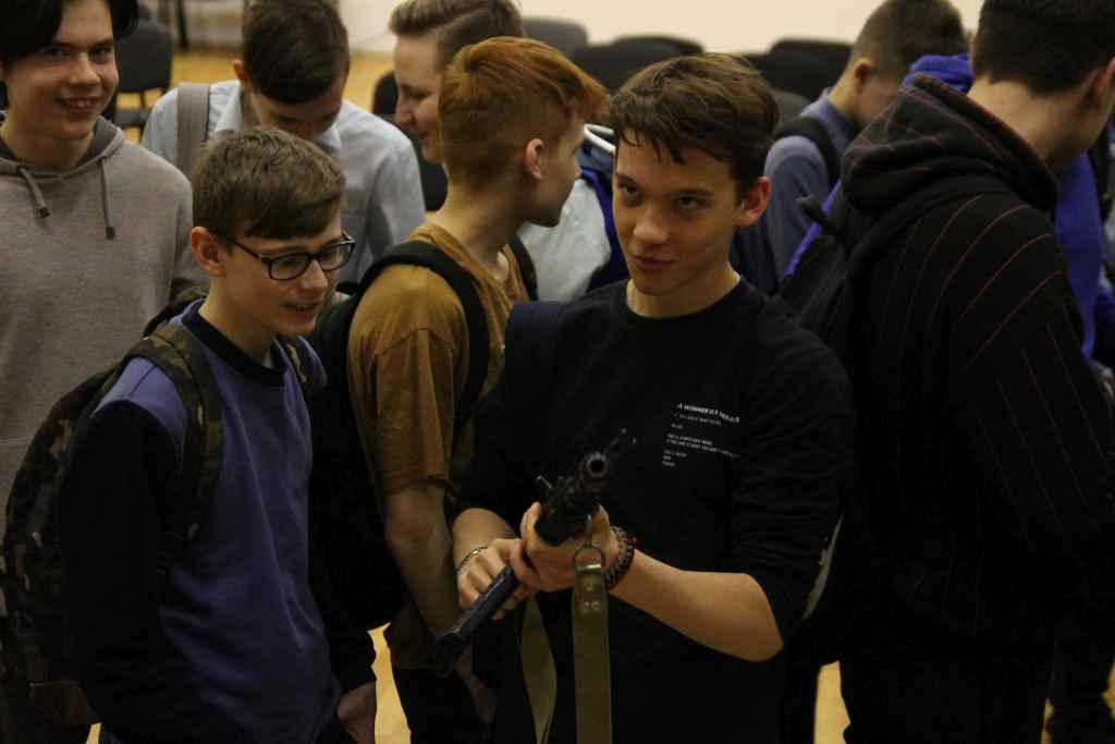 В самом конце ребятам показали несколько самых настоящих оружий разных видов. Там были винтовки, пистолеты, гранаты, а также различные снаряжения. Ребята моментально поднялись со своих мест, чтобы подойти и рассмотреть оружия. Гости подробно рассказывали про каждый экземпляр и отвечали на вопросы ребят.
