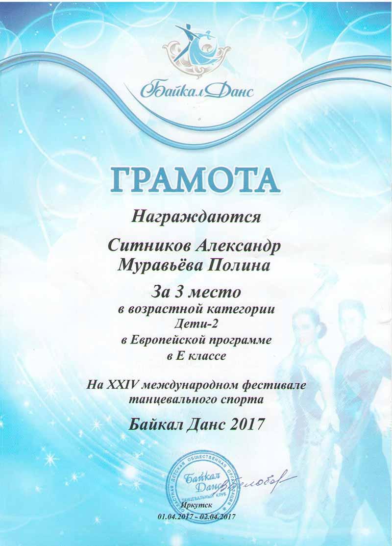 В Иркутске закончился XXIV международный фестиваль танцевального спорта «Байкал данс - 2017», где выступили Ситников Александр (учащийся 3 «А» класса) со своей партнершей Муравьёвой Полиной. Танцоры заняли 2 место в возрастной категории Дети - 2 в программе 6 танцев в «Е» классе и 3 место в Европейской программе в «Е» классе в той же возрастной категории.