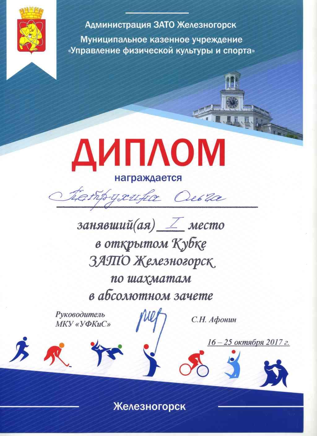 А на открытом Кубке ЗАТО Железногорск по шахматам (16-25 октября), Ольга Владимировна заняла I место в абсолютном зачете.