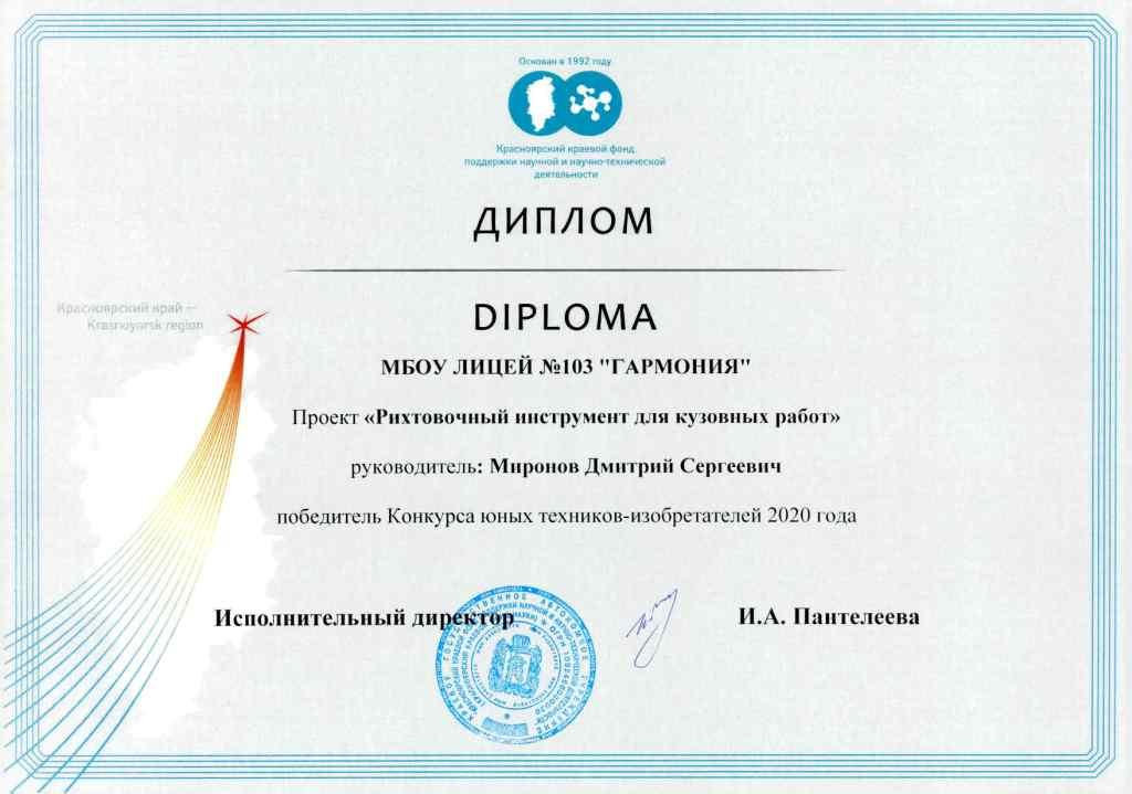 По результатам экспертизы научных отчетов и защиты работ, Миронов Дмитрий признан победителем конкурса юных техников-изобретателей. Дмитрий разрабатывал проект совместно с Денисом Мироновым, который также является победителем данного конкурса.