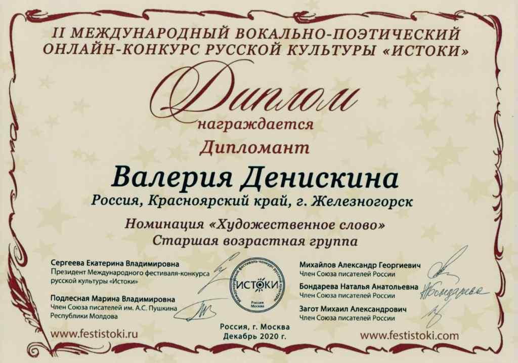 Ученица 11 «П» класса Валерия Денискина стала дипломантом номинации «Художественное слово» II Международного вокально-поэтического онлайн-конкурса русской культуры «Истоки». Валерия читала монолог Аси из пьесы Игоря Шприца «Не верь, не бойся, не проси…».