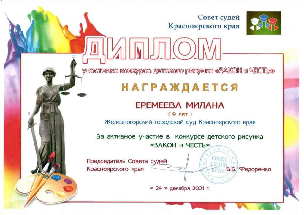 вручил диплом за участие в конкурсе рисунков «Закон и честь». Милана стала единственным участником от города в краевом конкурсе и  представила творческую художественную  работу на тему законности, правопорядка и правосудия.